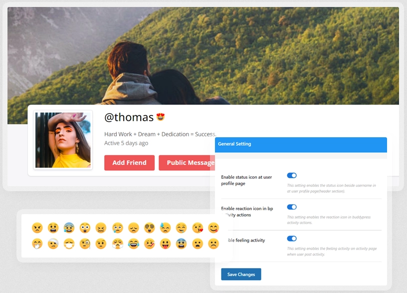 该插件允许您的社区成员更新他们当时正在做的事情的状态,并对所有活动操作做出反应。通过 BuddyPress 状态,允许您的会员在其个人资料标题旁边设置状态图标和标语,并使用此 BuddyPress 插件在所有发布的活动上显示其状态图标。 BuddyPress Status 附带一组内置图标,还允许您通过上传来创建自己的一组自定义图标。