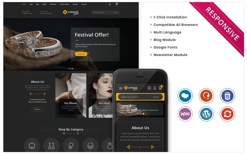 Luxolite Woocommerce 响应式珠宝主题主要是为了销售女性珠宝、女性配饰、婚礼收藏珠宝、民族珠宝、宝石、宝石等而创建的。