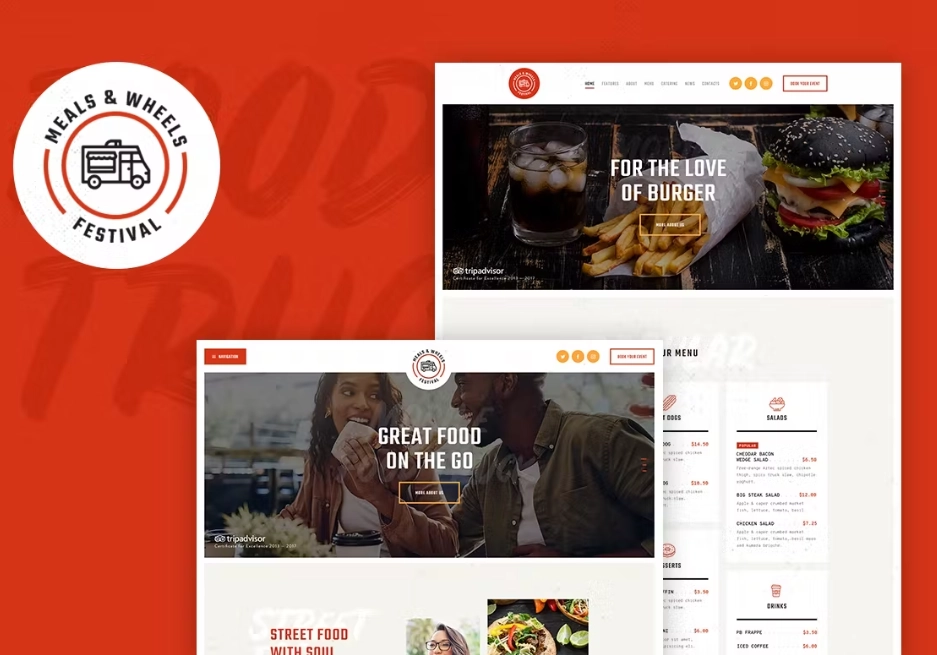 Meals Wheels 是一个时尚现代的街头美食 WordPress 主题。它专为快餐和食品配送网站或餐饮服务的食品车而设计。您还可以将其用作美食博客、生活方式博客、在线食谱、餐厅列表、移动应用程序、餐厅排名或食谱网站。
