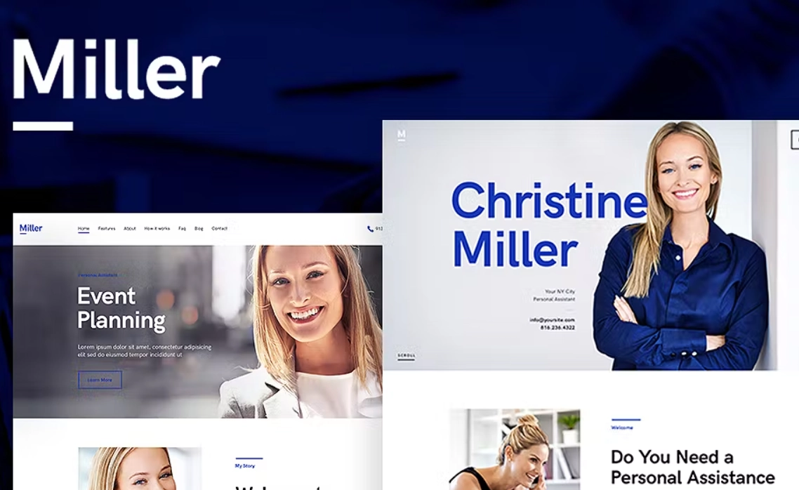 Miller 是一个新鲜、诱人的现代 WordPress 主题,适用于个人助理、顾问局、虚拟助理公司、援助机构、经理、网站管理公司、VA。它也适用于提供行政支持和秘书的人员。可能的受众行政服务 WordPress 主题它将适用于:业务协助、网站管理、个人差事服务、账单支付、安排会议、任务处理、时间管理、通信、电话支持、活动策划、礼宾服务、聚会策划和外包工作。个人助理WordPress布局它具有扎实的商业设计和漂亮的布局,可以展示您所有的主要服务、个人网站和技能。最重要的是,该主题同时具有:带有侧滚动条的弹出菜单和经典菜单。它还具有一页选项和多页设计。