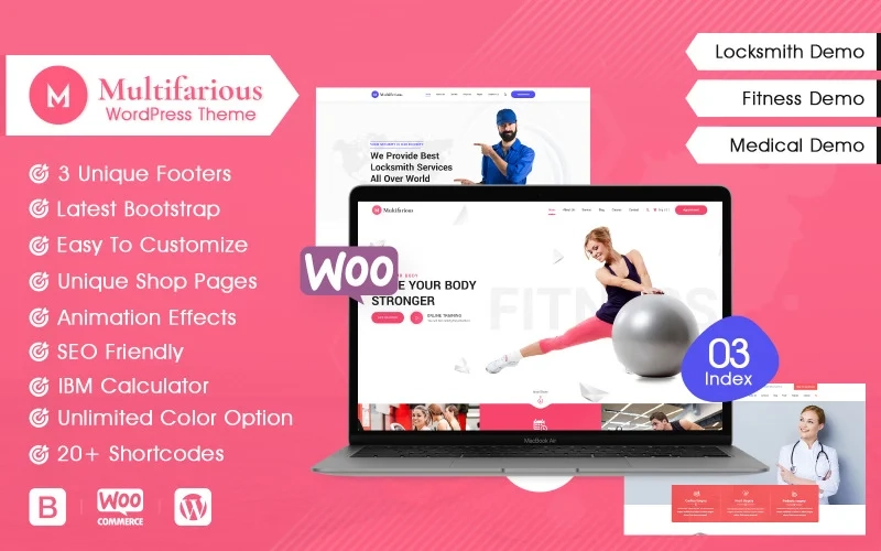 欢迎来到 Multifarious,这是一个功能强大的 WordPress 主题,其中包含您创建一个真正令人惊叹的网站并快速完成所需的一切! Multifarious专为健身相关业务而设计,如舞蹈、尊巴舞、健美操、体育俱乐部、私人教练、健美业务等。锁匠相关业务如住宅锁匠、商业锁匠、车辆锁匠、开锁服务、商业锁匠、钥匙复制、关键切割等医疗服务,如医院、诊所、实验室、药房、保健中心、营养师、药店、药品等。