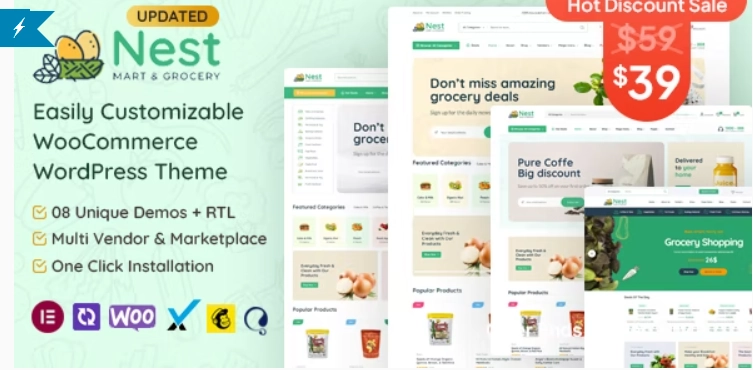 Nest 是一个干净的 WooCommerce WordPress 主题,由 Elementor 构建器提供支持。它是为多功能商店而建的,如大型商店、杂货店、超市、有机商店和网上商店,销售饮料、蔬菜、水果、冰淇淋、酱、香草、果汁、肉类、冷饮、香肠、鸡尾酒、软饮料等产品、饼干……