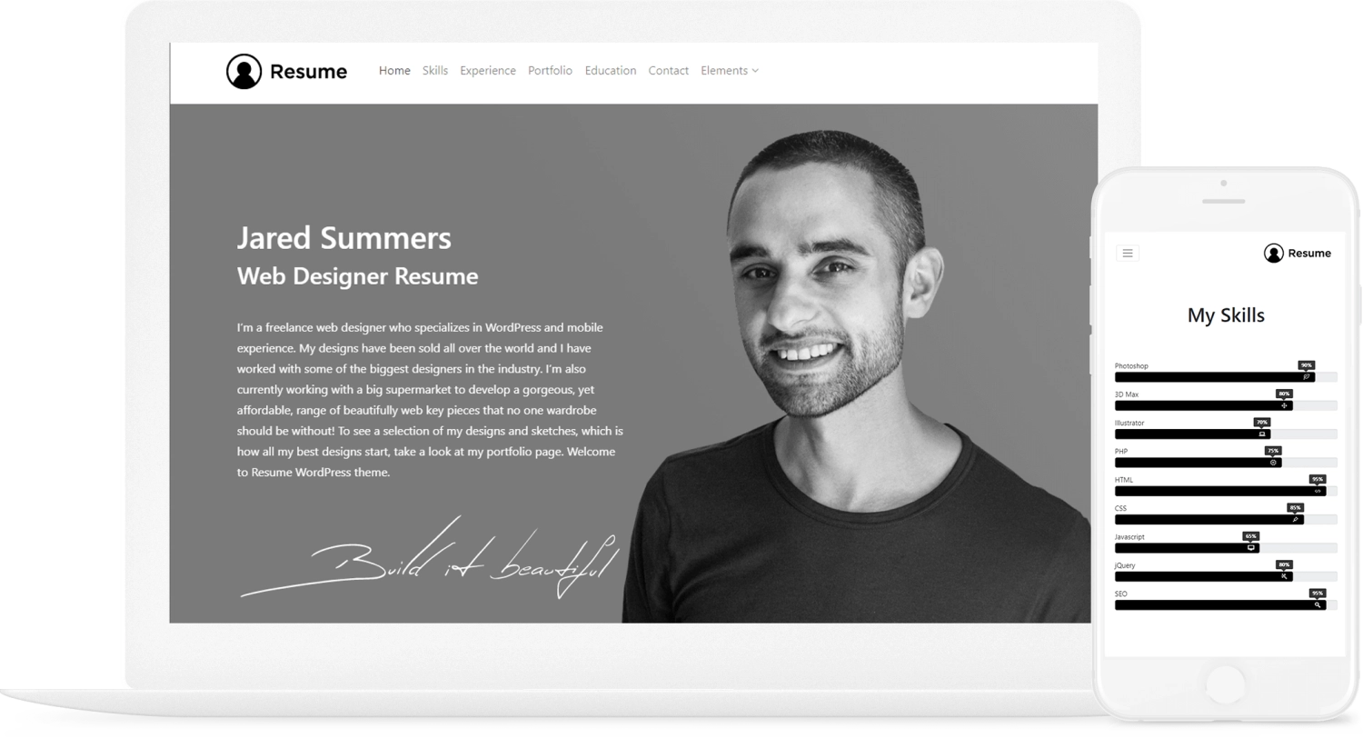 简历 WordPress 主题是一个易于定制的响应式简历/简历/电子卡/作品集主题,使用 bootstrap 4 制作。其独特而现代的设计,易于导航。单页布局可帮助您轻松组织并精美地展示您的技能、经验和作品集。
