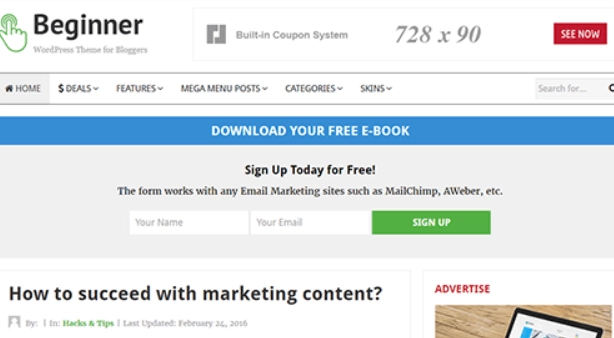 Beginner 以其简洁的设计非常适合希望其内容在页面上脱颖而出的博主。 借助强大的主题定制器功能,您可以轻松地个性化该主题的许多方面,以确保您的博客具有正确的外观和感觉。 对于任何想要使用联盟营销来通过博客获利的人来说,优惠券功能都会派上用场。